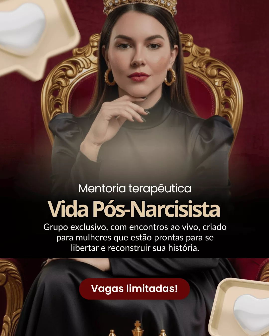 Com a Mentoria Vida Pós-Narcisista, reconstrua sua vida com consciência, força e amor-próprio. Resgate sua essência, aprenda a identificar padrões narcisistas, reforce sua autoestima e confiança, e viva uma vida autêntica, leve e consciente. Em um grupo exclusivo composto por mulheres e mediado por uma Psicóloga especialista no assunto, serão realizados 6 encontros ao vivo, quinzenais, com conteúdo, práticas terapêuticas e trocas significativas em um grupo exclusivo - um caminho guiado passo a passo para que você reconstrua sua vida com consciência, força e amor-próprio.